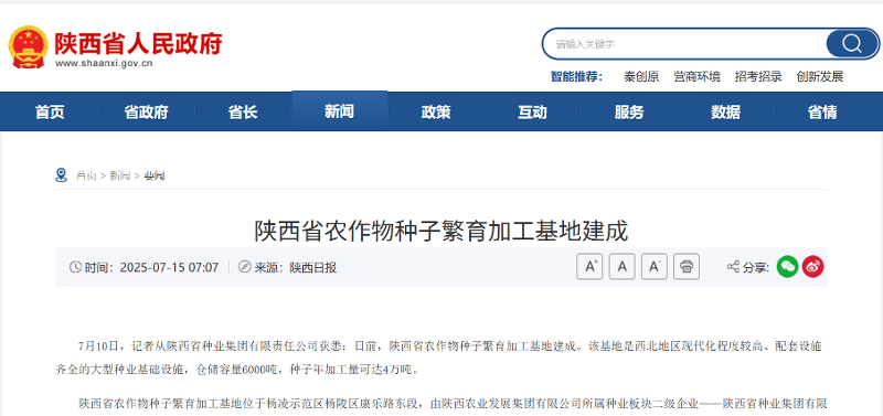 【陕西省人民政府】陕西省农作物种子繁育加工基地建成